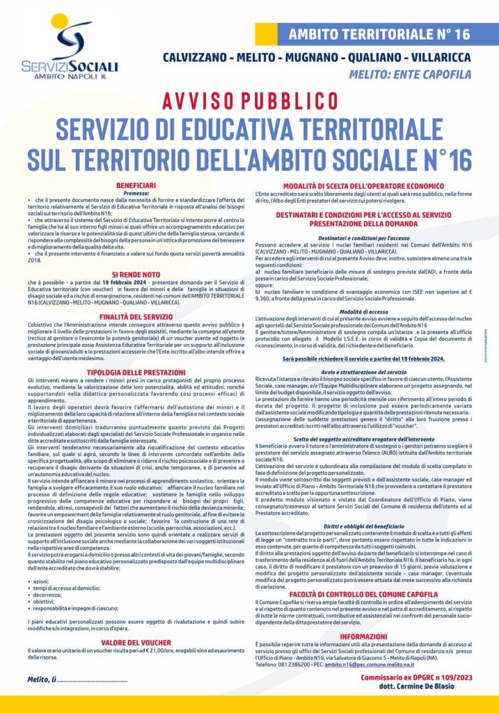 Attivazione servizio di educativa territoriale sul territorio dell’Ambito N. 16
